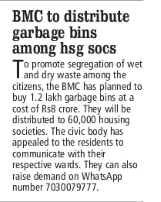BMC to distribute Two Free of Cost 120 litre Garbage Bins for housing societies in Mumbai interested in WET & DRY segregation of garbage. January 11, 2024 yazdi1 Comment FREE FREE FREE BMC to distribute Two Free of Cost 120 litre Garbage Bins for housing societies in Mumbai interested in WET & DRY segregation of garbage. Interested societies to contact Local wards or Whatsapp on 7030079777.